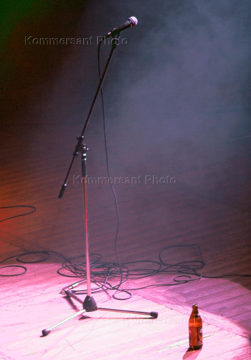 A microphone and an empty beer bottle on the stage of the Gorbunova concert hall after the concert of the ultra-left punk-band Grazhdanskaya Oborona ('Civic Defence').