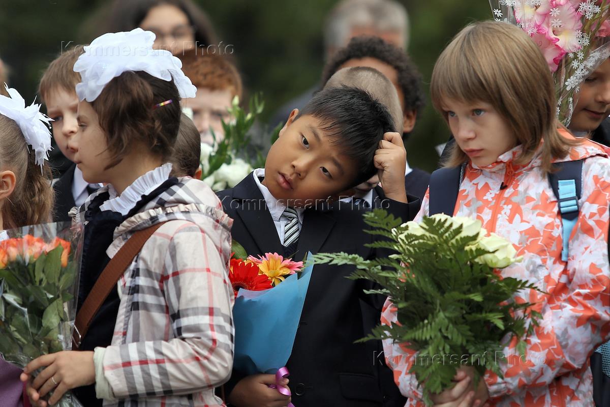 Ученики школы №830 на праздничной линейке, посвященной началу учебного года и Дню знаний.