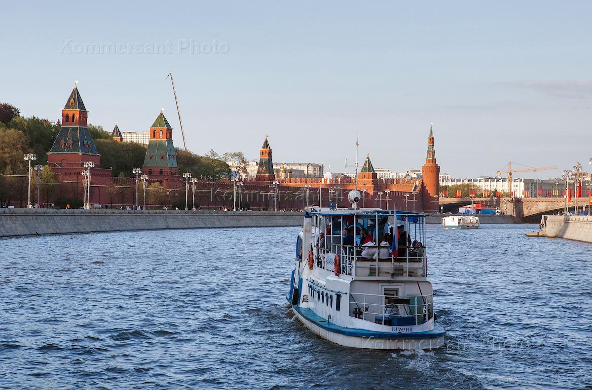 Виды Москвы. Памятник российскому императору Петру Первому работы скульптора Зураба Церетели на Стрелке Москва-реки. Теплоход "Валерий Брюсов".