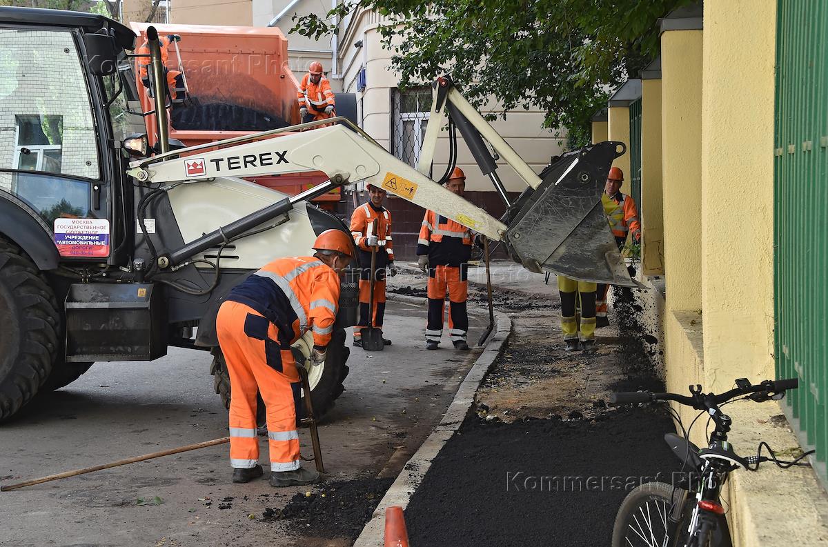 Жанровая фотография. Работы по благоустройству города. Укладка асфальта на пешеходной зоне.