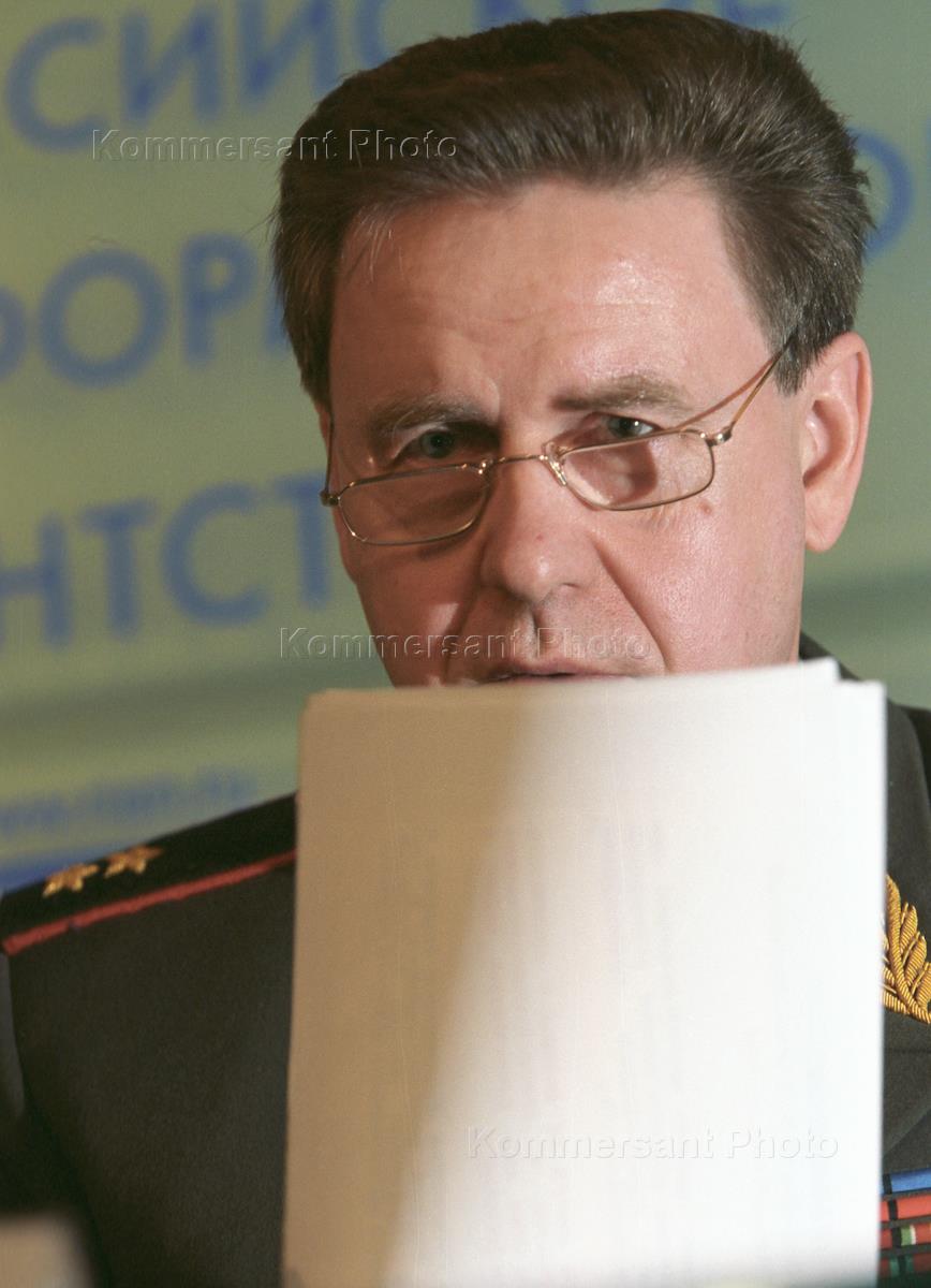 Head of the Russian General Staff mobilisation directorate, deputy chief of the General Staff Lieutenant-General Vasily Smirnov is interviewed at the news conference headlined 'Federal Programme of Transition from Conscript to Professional (Volunteer) Armed Forces'. The news conference was held in the RIA-Novosti headquarters.