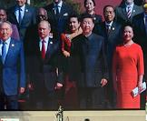 Торжества, посвященные 70-летию победы китайского народа в Войне сопротивления Японии и окончания Второй мировой войны, прошли на площади Тяньаньмэнь. Слева направо: президент Казахстана Нурсултан Назарбаев, президент России Владимир Путин и председатель КНР Си Цзиньпин с супругой Пэн Лиюань во время военного парада.