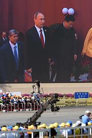 Торжества, посвященные 70-летию победы китайского народа в Войне сопротивления Японии и окончания Второй мировой войны, прошли на площади Тяньаньмэнь. Слева направо: президент Киргизии Алмазбек Атамбаев, президент России Владимир Путин и председатель КНР Си Цзиньпин перед началом военного парада.