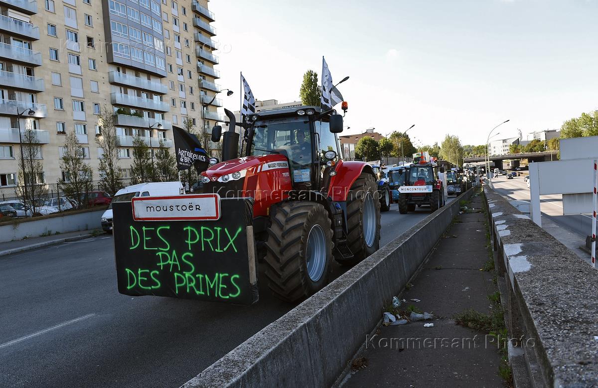 Фермеры во время акции протеста в Париже против кризиса в агропромышленной отрасли. Работники сельскохозяйственной отрасли выступают за повышение закупочных цен на мясную и молочную продукцию, а также за увеличение программ государственной помощи.