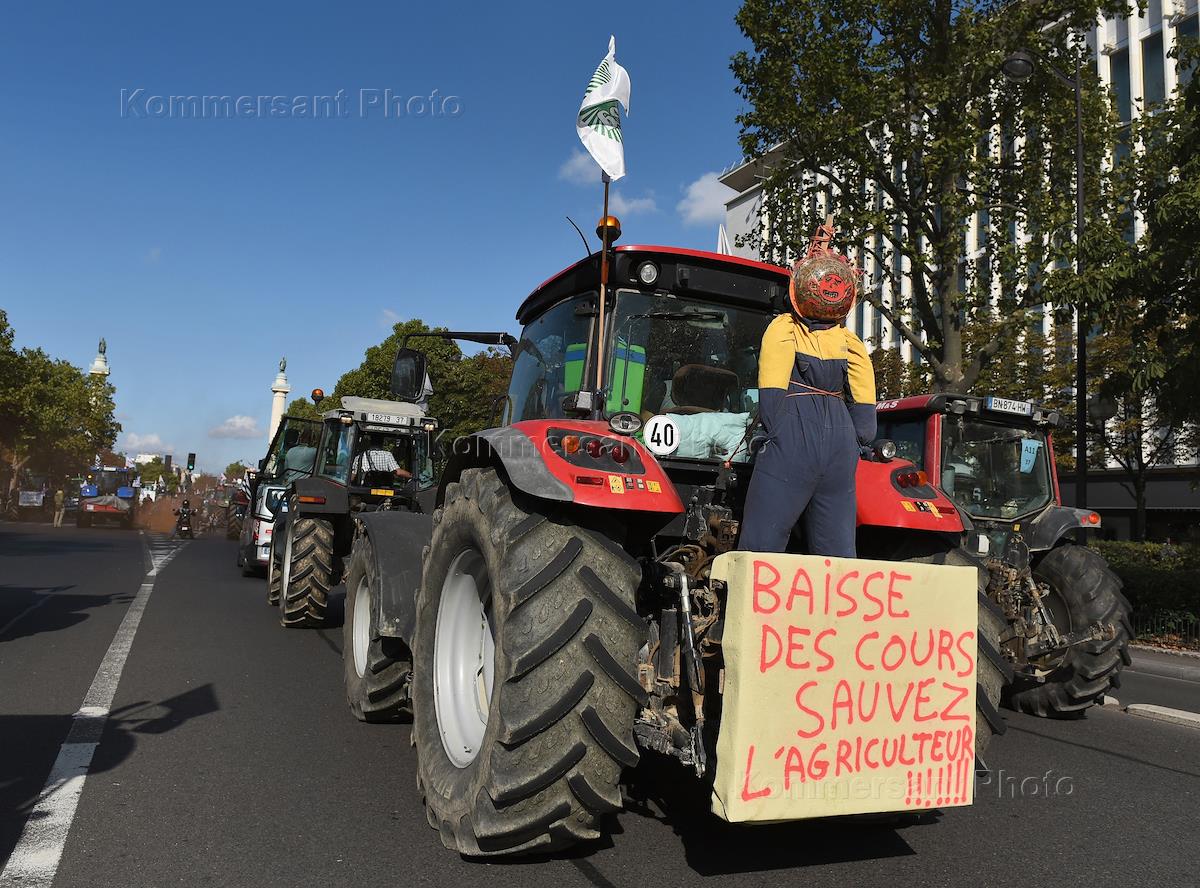 Фермеры во время акции протеста в Париже против кризиса в агропромышленной отрасли. Работники сельскохозяйственной отрасли выступают за повышение закупочных цен на мясную и молочную продукцию, а также за увеличение программ государственной помощи.