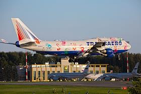 Жанровая фотография. Самолет авиакомпании "Трансаэро" Boeing 747 "Рейс надежды" (Ладошки) в аэропорту Внуково.