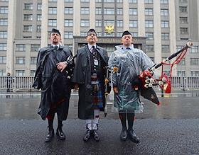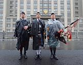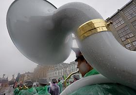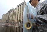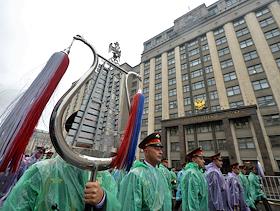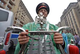 Празднование Дня Города в Москве. Праздничные мероприятия на улицах столицы. Шествие военных оркестров по Тверской улице. Музыканты военного оркестра у здания Государственной думы на Охотном ряду.