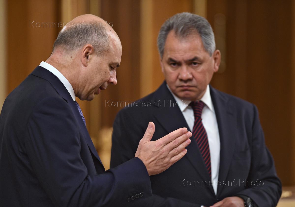 Министр финансов России Антон Силуанов (слева) и министр обороны России Сергей Шойгу (справа) перед началом заседания правительства России.