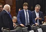 Председатель комитета Государственной думы России по регламенту и организации работы Государственной Думы Сергей Попов (в центре) перед началом общее собрание членов Российского исторического общества (РИО). Заседание прошло в Фундаментальной библиотеке Московского государственного университета (МГУ) имени М.В.Ломоносова.