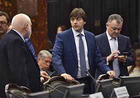 Руководитель Федеральной службы России по надзору в сфере образования и науки Сергей Кравцов (в центре) перед началом общее собрание членов Российского исторического общества (РИО). Заседание прошло в Фундаментальной библиотеке Московского государственного университета (МГУ) имени М.В.Ломоносова.