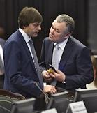 Руководитель Федеральной службы России по надзору в сфере образования и науки Сергей Кравцов (слева) перед началом общее собрание членов Российского исторического общества (РИО). Заседание прошло в Фундаментальной библиотеке Московского государственного университета (МГУ) имени М.В.Ломоносова.