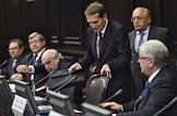 Председатель Государственной думы России Сергей Нарышкин (в центре) и вице-президент РАН, ректор Московского государственного университета (МГУ) МГУ имени М.В.Ломоносова Виктор Садовничий (второй справа) во время Общего собрания членов Российского исторического общества. Собрание прошло в Фундаментальной библиотеке МГУ им. Ломоносова .