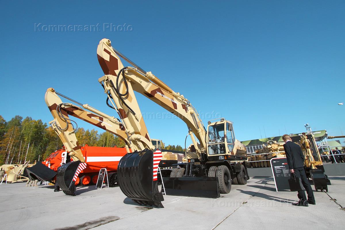 Международная выставка вооружения, военной техники и боеприпасов Russia Arms EXPO 2015 открылась на полигоне "Старатель". Экскаваторы производства АО «Научно-производственная корпорация «Уралвагонзавод».