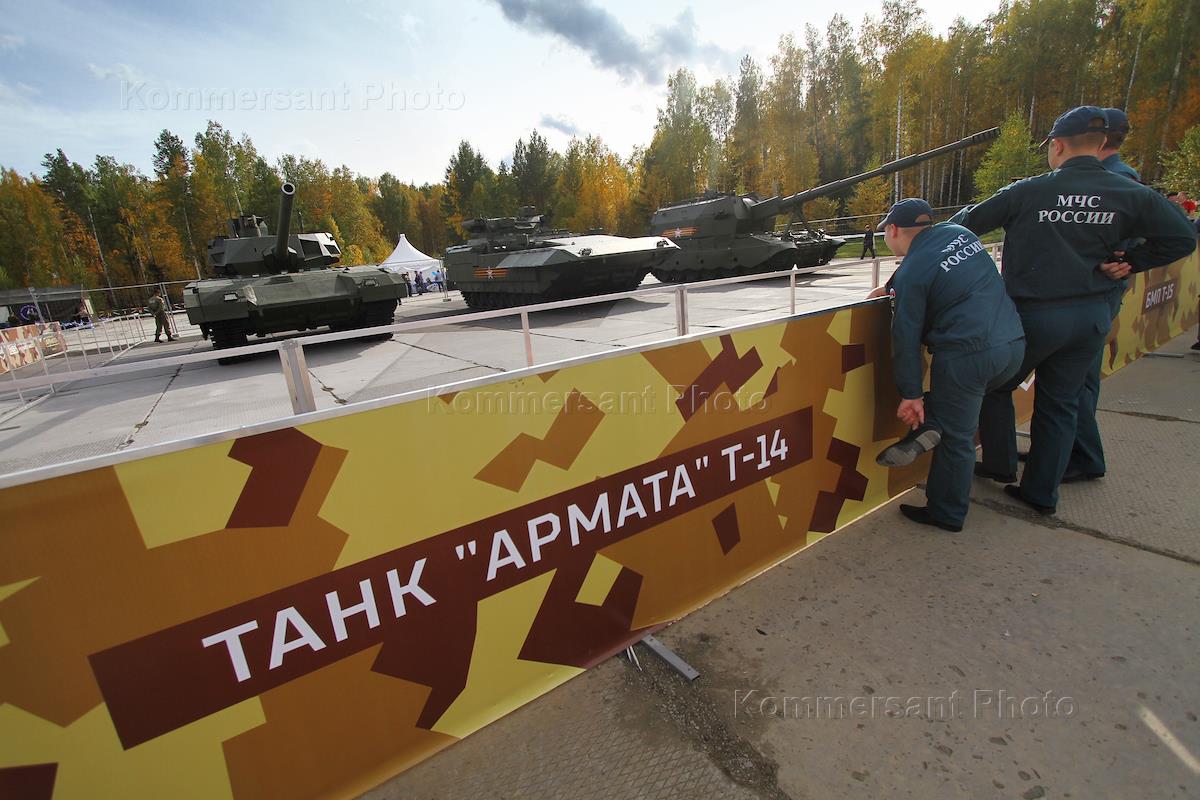 Боевые машины на базе гусеничной платформы "Армата": танк Т-14, боевая машина пехоты Т-15 и самоходно-артиллерийская установка "Коалиция" на международной выставке вооружения, военной техники и боеприпасов Russia Arms EXPO 2015 на полигоне "Старатель".