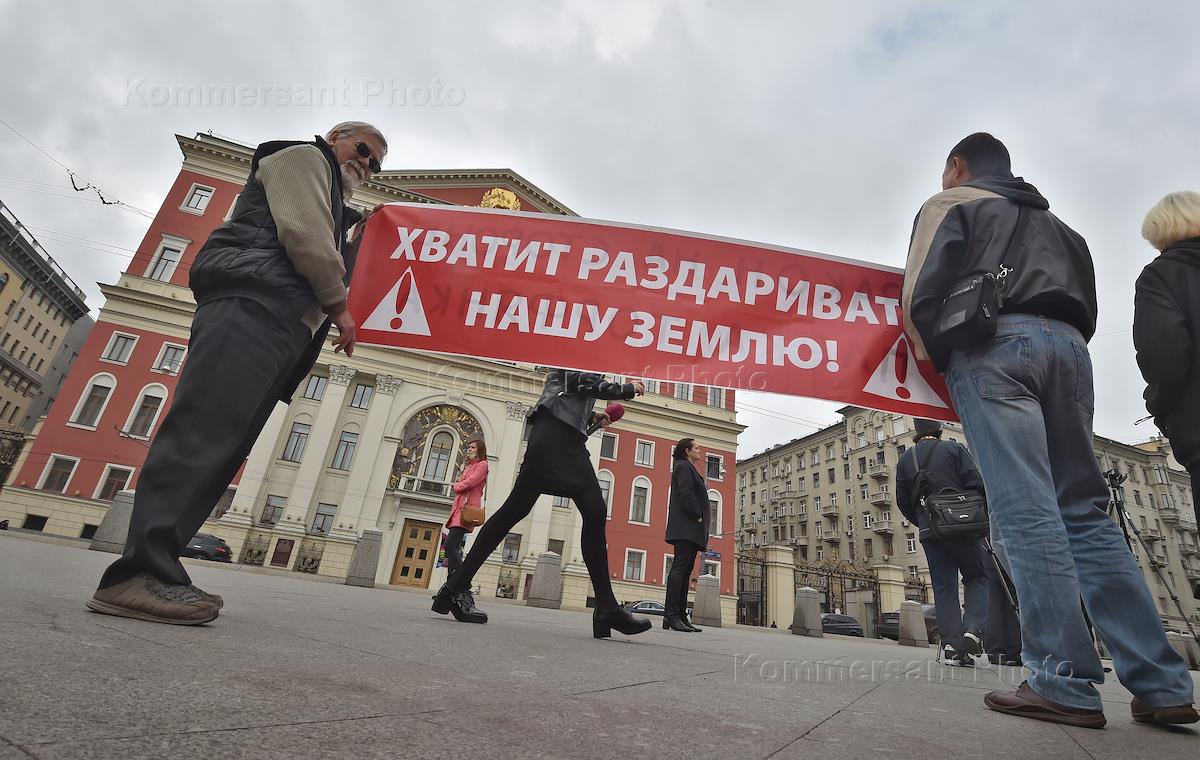 Акция защитников парка "Торфянка" прошла на Тверской площади напротив здания мэрии Москвы. Член комитета Государственной думы России по экономической политике, инновационному развитию и предпринимательству Александр Потапов во время акции.