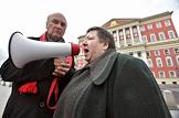 Акция защитников парка "Торфянка" прошла на Тверской площади напротив здания мэрии Москвы. Член комитета Государственной думы России по экономической политике, инновационному развитию и предпринимательству Александр Потапов (слева) во время акции.