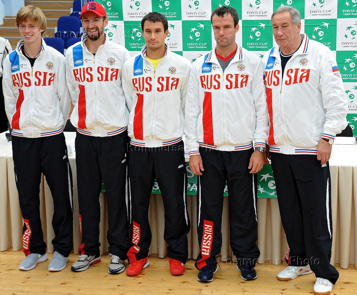 Слева направо: российские теннисисты Андрей Рублев , Константин Кравчук, Евгений Донской, Теймураз Габашвили, президент Федерации тенниса России, капитан сборной России Шамиль Тарпищев после жеребьевки среди участников матча Кубка Дэвиса между сборными России и Италии, который пройдет с 18 по 20 сентября в спорткомплексе "Байкал-Арена".