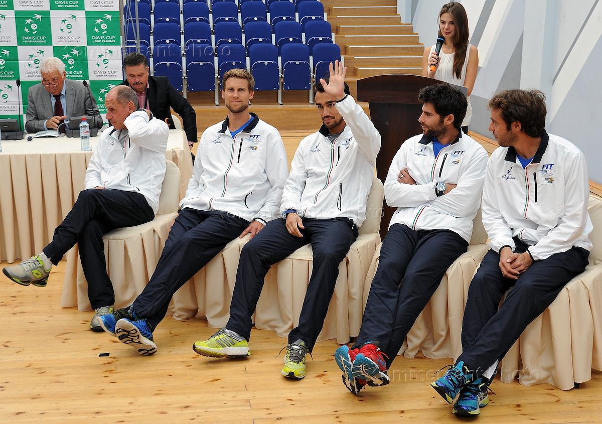 Официальная церемония жеребьевки поединка плей-офф Мировой группы Кубка Дэвиса между командами России и Италии. Матчи состоятся с 18 по 20 сентября в спорткомплексе "Байкал-Арена". Теннисты сборной Италии во время жеребьевки.