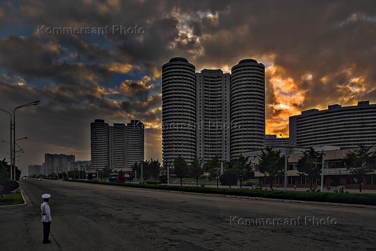 Жанровая фотография. Виды Пхеньяна. Регулировщик на пустой дороге.