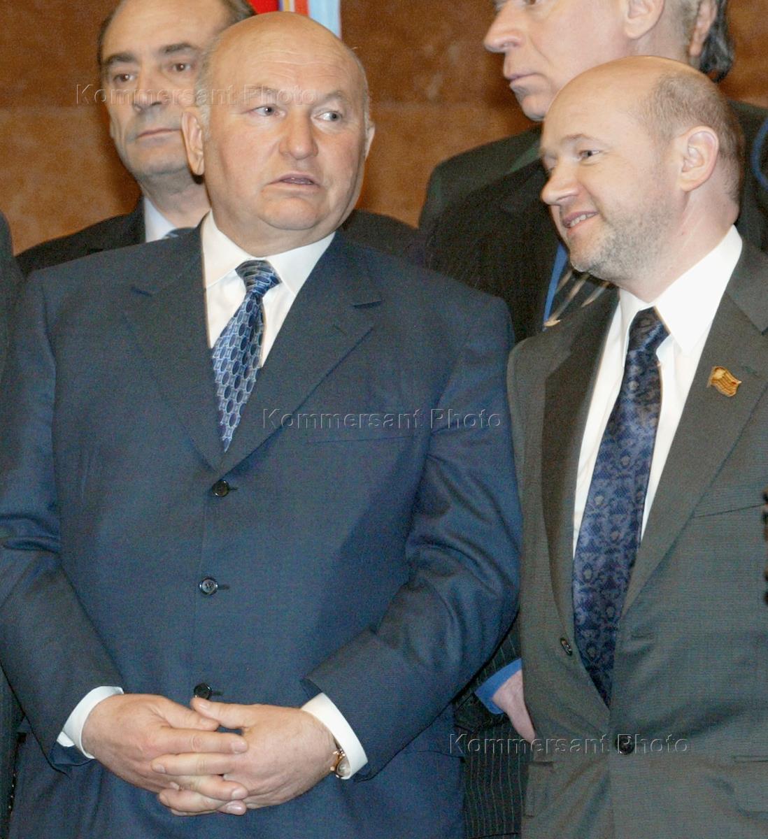 Moscow Mayor Yury Luzhkov (right) and Vice-Mayor Valery Shantsev (left) take part in the opening ceremony of the Park Pobedy ('Victory Park') underground station.