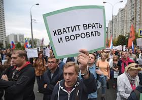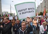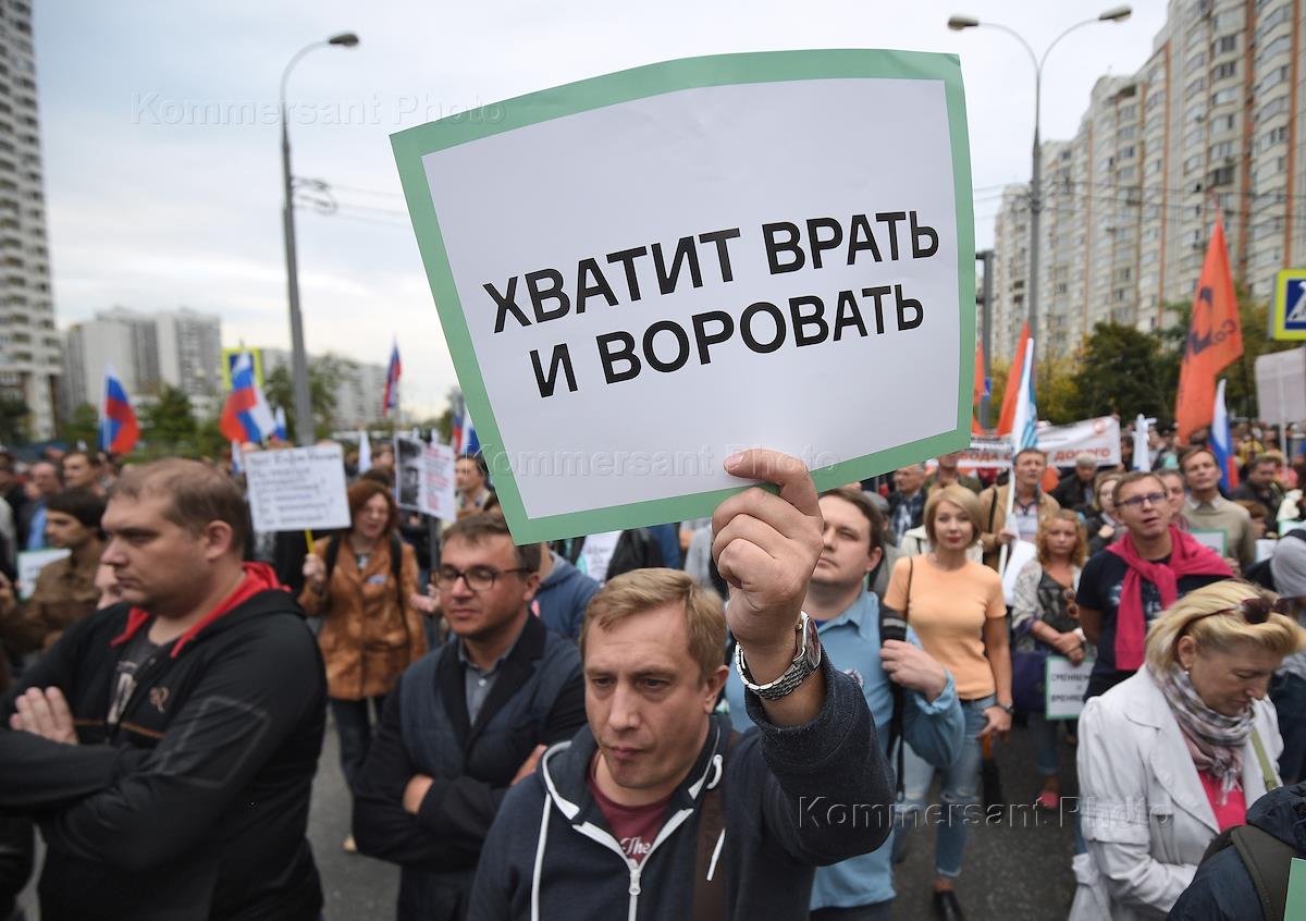 Шествие и митинг сторонников оппозиционера Алексея Навального прошел в Марьино. Участник акции с плакатом "Хватит врать и воровать".