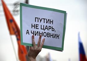 Шествие и митинг сторонников оппозиционера Алексея Навального прошел в Марьино. Участник акции с плакатом "Путин не царь, а чиновник".
