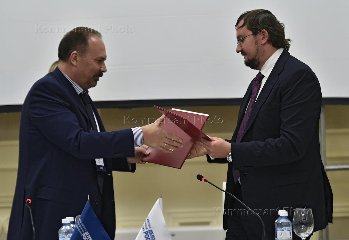 Министр строительства и жилищно-коммунального хозяйства России Александр Мень (слева) и президент "Деловой России" Алексей Репик (справа) в "День открытых дверей" для лидеров рынка недвижимости в "Деловой России".