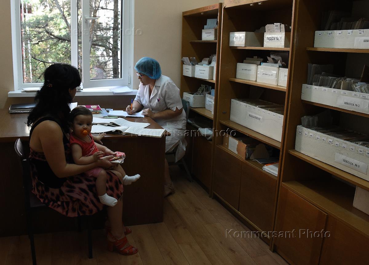 Проведение привовочных мероприятий по профилактики заболевания - полиомиелит. Молодая мама с ребенком и медсестра в регистратуре районной детской поликлиники.