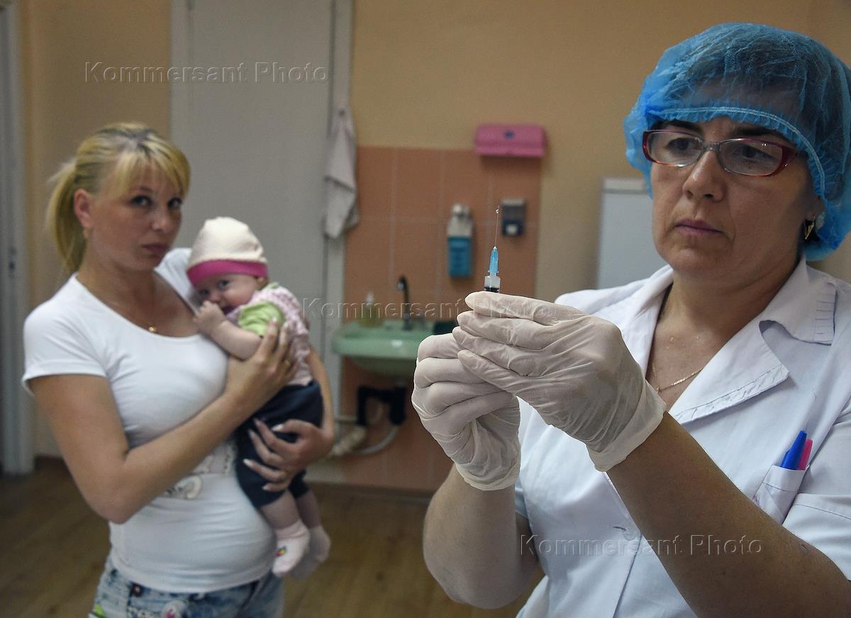 Проведение привовочных мероприятий по профилактики заболевания - полиомиелит. Прививочный кабинет в районной детской поликлиники. Молодая мама с ребенком и медсестра во время прививки.