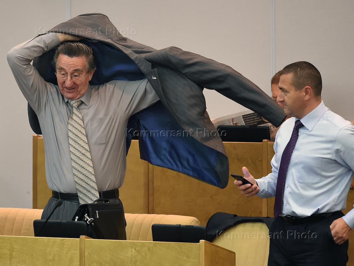 Member of the housing policy and housing and utility service committee of the Russian State Duma Yury Selivanov (left) and deputy of the chairman of the nature resources, nature management and ecology committee of the State Duma Anatoly Greshnevikov (in the centre) are during the plenary sitting of the State Duma.
