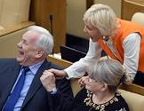 Министр финансов России Антон Силуанов (слева), его заместитель Алексей Лавров (справа), член комитета Государственной думы России по науке и наукоемким технологиям Жорес Алферов (внизу) во время думского заседания.