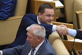 Заместитель председателя комитета Государственной думы (ГД) России по конституционному законодательству и государственному строительству Дмитрий Вяткин (в центре) и член комитета Государственной думы (ГД) России по безопасности и противодействию коррупции Владимир Васильев (справа) на пленарном заседании Госдумы.