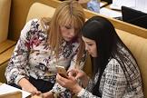 Первый заместитель председателя комитета Государственной думы (ГД) России по международным делам Светлана Журова (слева) и член комитета Государственной думы (ГД) России по финансовому рынку Марина Мукабенова (справа) во время думского пленарного заседания.