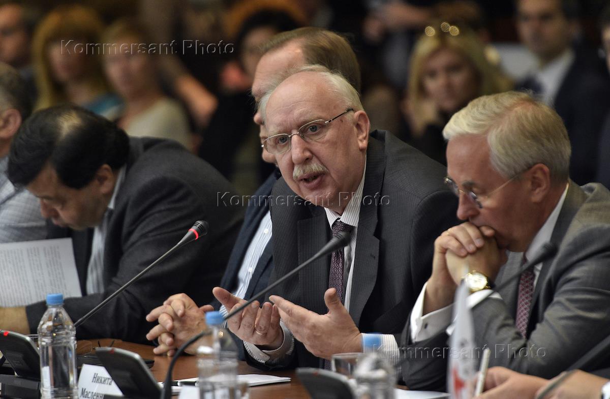 Член научного совета Московского Центра Корнеги, руководитель Центра политико-географических исследований Николай Петров (слева) и заместитель директора Института мировой экономики и международных отношений Российской академии наук (ИМЭМО РАН) Евгений Гонтмахер (справа) во время заседания Комитета гражданских инициатив, посвященное обсуждению Аналитического доклада "Новое позиционирование России в глобальном хозяйстве – возможности и перспективы" и Методики оценки социально-экономической и политической напряженности в регионах. Заседание прошло в Центре международной торговли (ЦМТ).