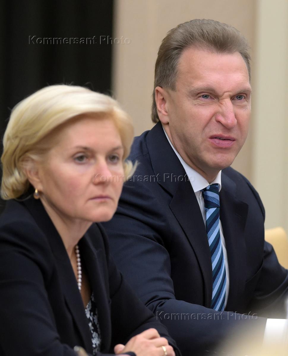 Заместитель председателя правительства России Ольга Голодец (cлева) и первый заместитель председателя правительства России Игорь Шувалов (справа) во время совещания президента России Владимира Путина с членами правительства в резиденции Ново-Огарево.