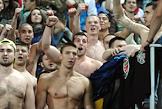 Лига Европы по футболу. Матч между командами "Локомотив" (Россия, Москва) и "Скендербеу" (Албания, Корча) на стадионе "Локомотив". Болельщики на трибуне во время матча.