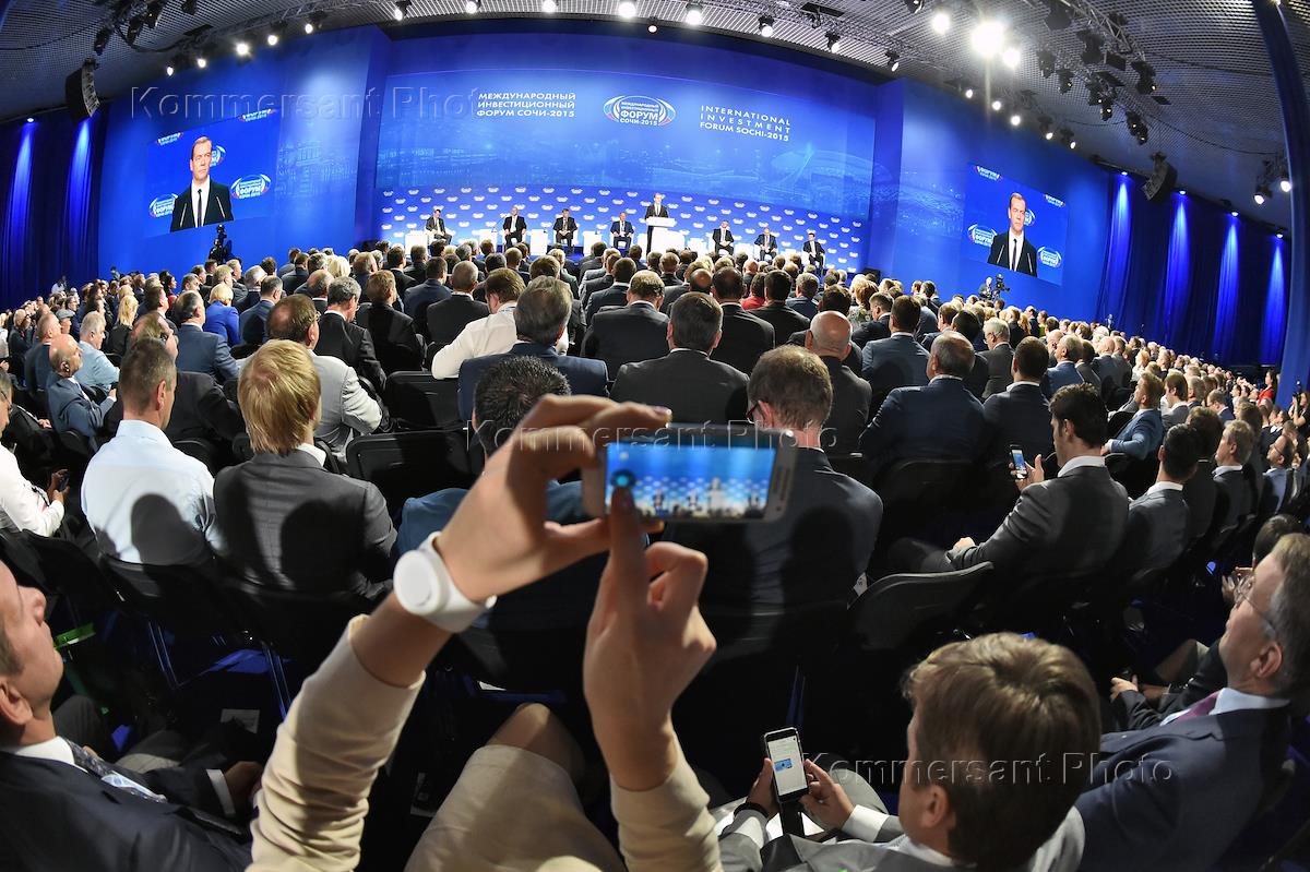 Международный инвестиционный форум "Сочи-2015" прошел в Главном медиацентре. День первый. Председатель правительства России Дмитрий Медведев на пленарном заседании "Вернуться к росту. Стратегии для России".
