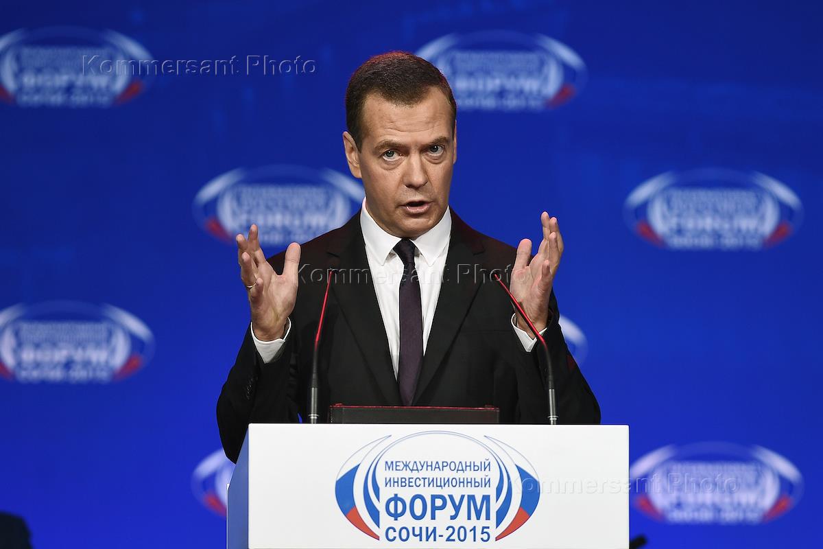 Рабачая поездка председателя правительства Дмитрия Медведева в Сочи. Международный инвестиционный форум "Сочи-2015" прошел в Главном медиацентре. День первый. Председатель правительства России Дмитрий Медведев во время форума.