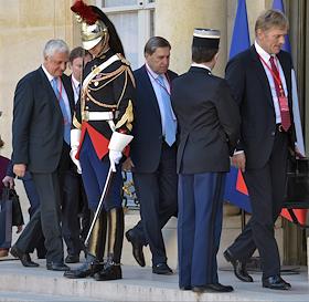 Визит президента России Владимира Путина во Францию. Переговоры лидеров стран "нормандской четверки". Помощник Президента России Юрий Ушаков (в центре) и заместитель руководителя администрации президента России, пресс-секретарь президента Дмитрий Песков (справа) во время официальной церемонии встречи.