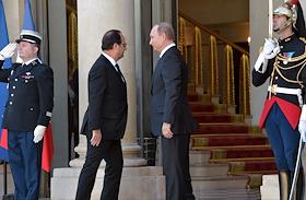 Визит президента России Владимира Путина во Францию. Переговоры лидеров стран "нормандской четверки". Президент России Владимир Путин (слева) и президент Франции Франсуа Олланд (справа) во время официальной церемонии встречи.