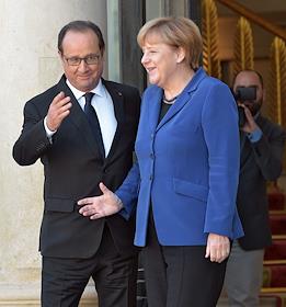 Визит президента России Владимира Путина во Францию. Переговоры лидеров стран "нормандской четверки". Президент Франции Франсуа Олланд (справа) и канцлер Германии Ангела Меркель (слева) во время официальной церемонии встречи.