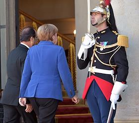 Визит президента России Владимира Путина во Францию. Переговоры лидеров стран "нормандской четверки". Президент Франции Франсуа Олланд (слева) и канцлер Германии Ангела Меркель (справа) во время официальной церемонии встречи.