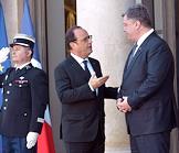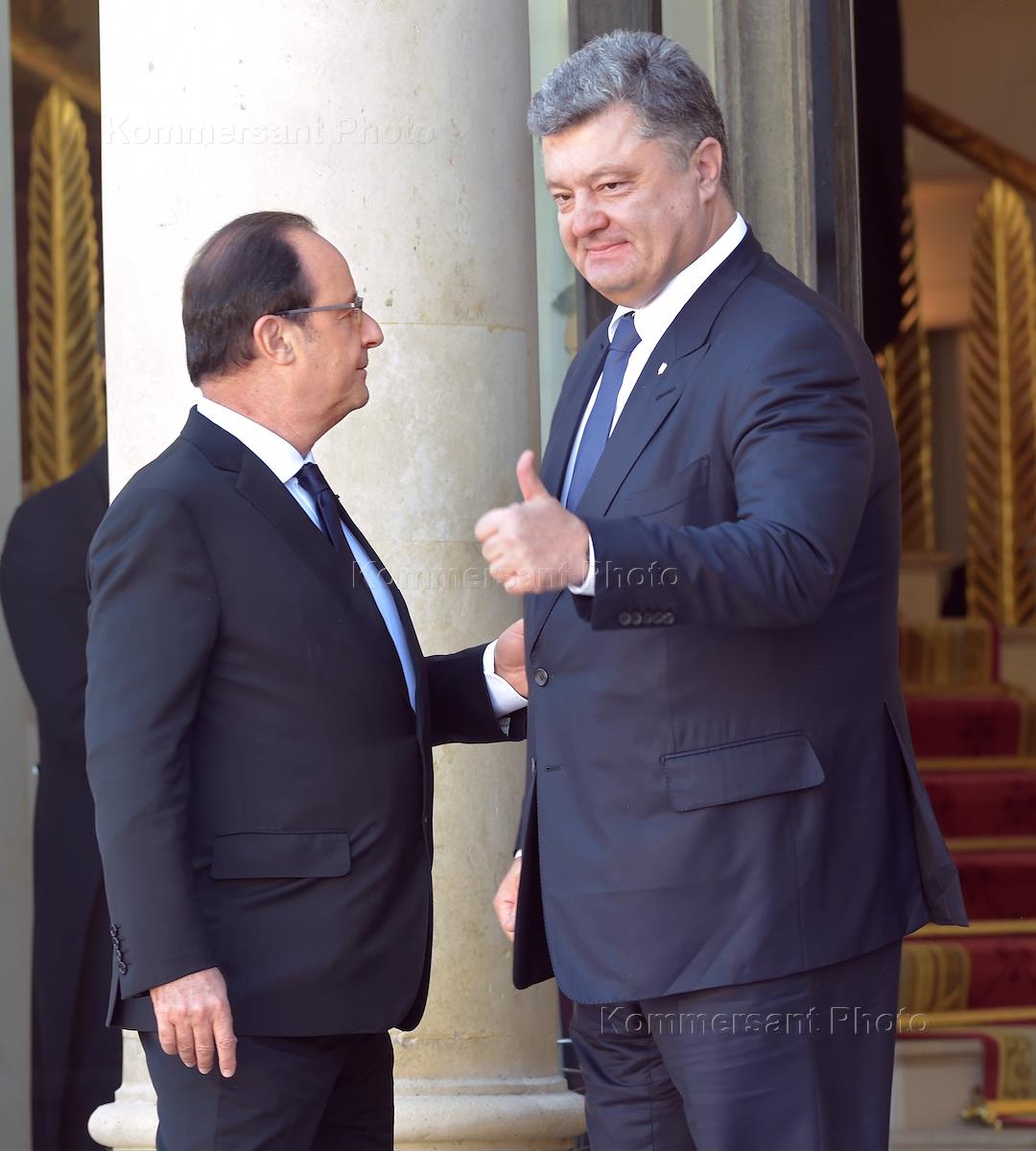 Визит президента России Владимира Путина во Францию. Переговоры лидеров стран "нормандской четверки". Президент Франции Франсуа Олланд (слева) и президент Украины Петр Порошенко (справа) после встречи.