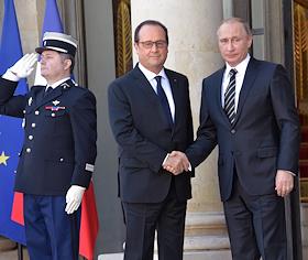 президента России Владимира Путина во Францию. Переговоры лидеров стран "нормандской четверки". Президент России Владимир Путин (в центре) и президент Франции Франсуа Олланд (справа) во время официальной церемонии встречи.