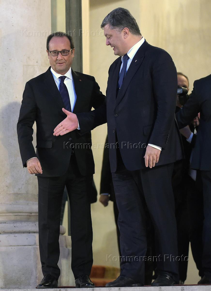 Визит президента России Владимира Путина во Францию. Переговоры лидеров стран "нормандской четверки". Президент Франции Франсуа Олланд (слева) и президент Украины Петр Порошенко (справа) после встречи.