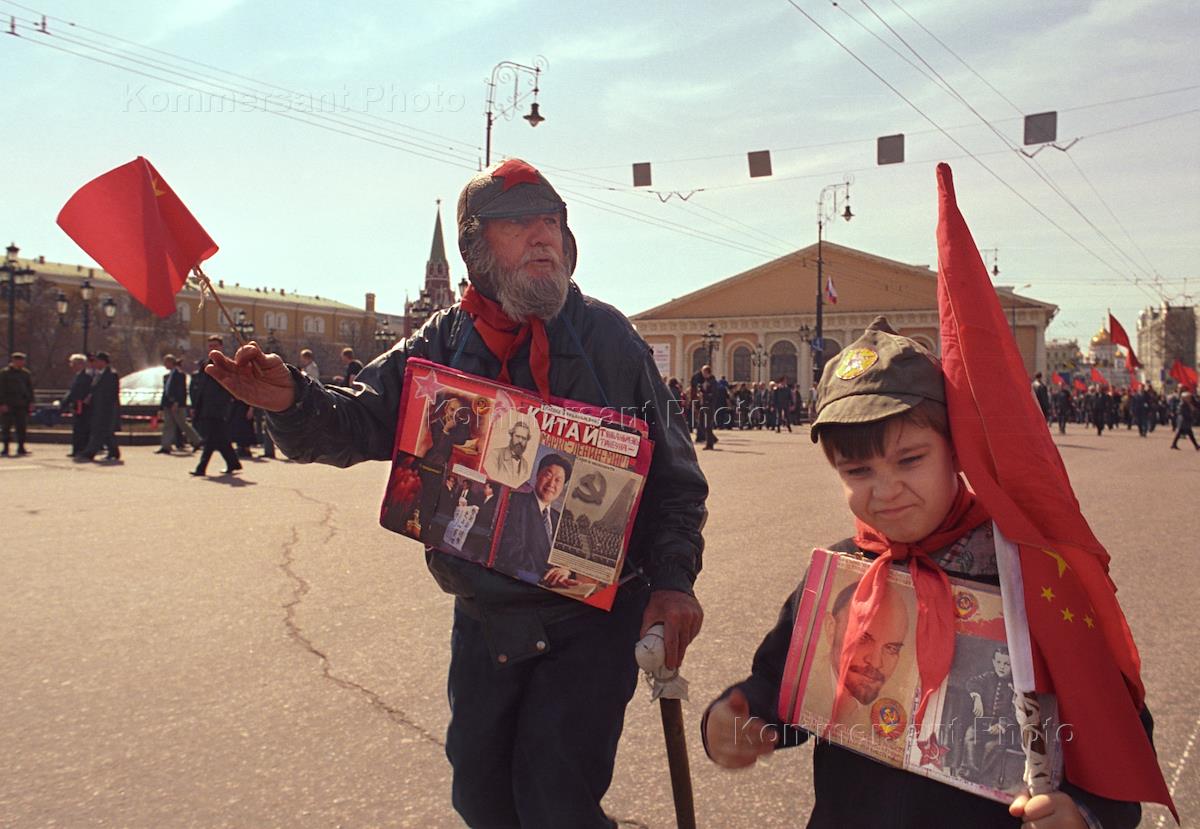 Участники праздничного митинга, организованного московской федерацией профсоюзов, дедушка и ребенок держат плакат с советской символикой. Митинг прошел на Манежной площади.