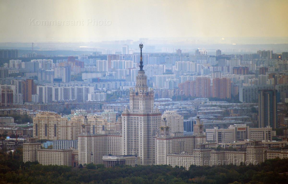Виды Москвы с площадки верхней части "Башни Федерация" Международного бизнес-центра "Москва-Сити". Главный корпус Мсковского государственного университета (МГУ) имени Ломоносова на Воробьевых горах.