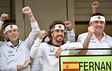 Гран-при России - Российский этап гонок "Формулы-1" в Сочи. Пилот команды "Макларен" Фернандо Алонсо (в центре), гоночный директор команды “Макларен” Эрик Булье (справа) на фотосессии в честь своей 250-й гонки в "Формуле-1" во время подготовки к первой сессии свободных заездов на российском этапе чемпионата мира по кольцевым автогонкам в классе "Формула-1".