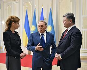 Президент Украины Петр Порошенко (справа) с супругой Мариной (слева) и президент Казахстана Нурсултан Назарбаев (в центре) во время торжественной церемонии встречи.