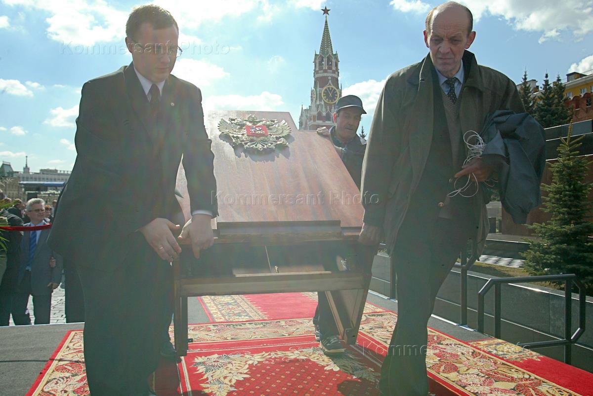Рабочие несут трибуну для проведения Военного парада, посвященного 58-й годовщине Победы в Великой отечественной войны. Парад прошел на Красной площади.